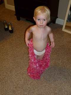 While I was folding clothes Q was putting on every pair of shoes I have - which is her latest obsession - she will get her a pair and bring me a pair - it's pretty funny...so her and I pretty much wear heels around the house all day - good times!!! She gets so excited to wear different ones and to have me wear them too!!! She found this scarf in my closet and I put it on her like a dress - she thought it was too fun!!